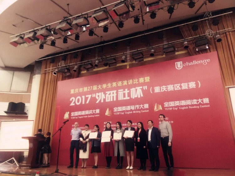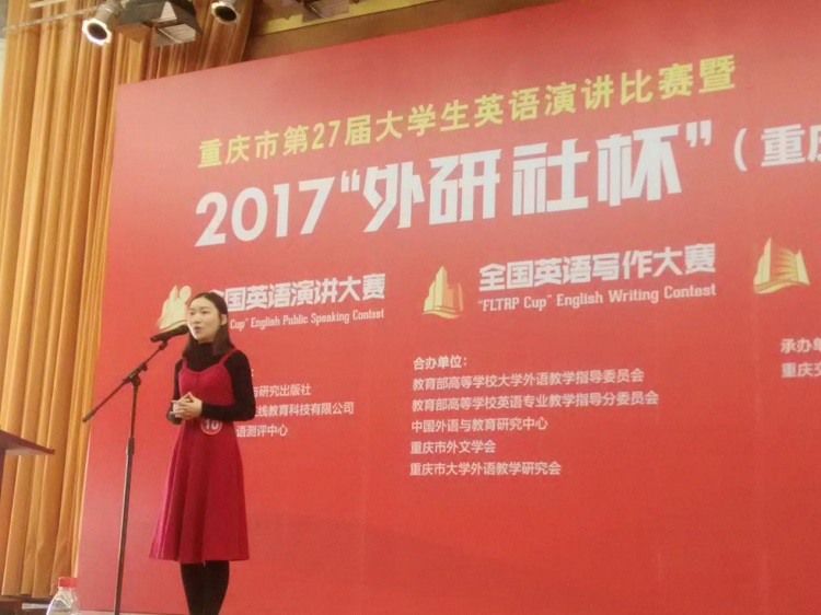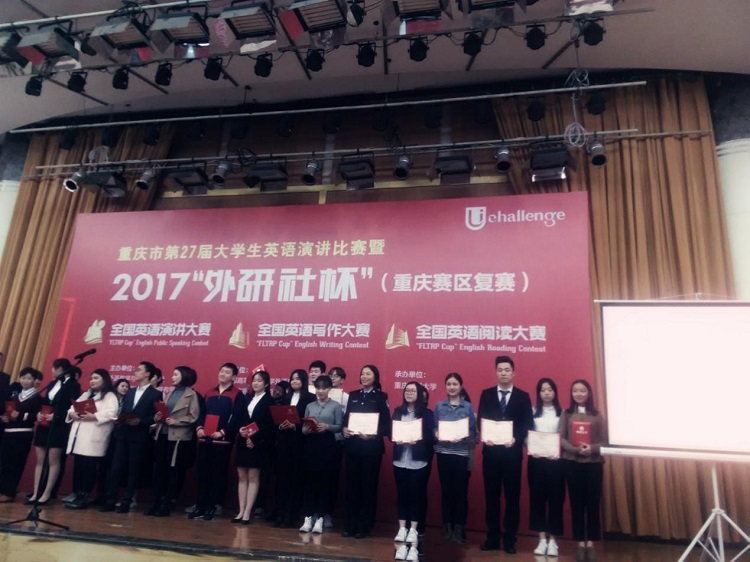 ,重庆市第27届大学生英语演讲大赛暨2017年“外研社杯”全国英语演讲大赛、写作大赛及阅读大赛重庆赛区决赛在重庆交通大学举行。此次比赛,共有全市二十余所高校的一百多名选手参加,我校选派了9名选手参赛。经过层层角逐,我校学子最终共获得重庆赛区一等奖4项,二等奖2项,三等奖8项的优异成绩。