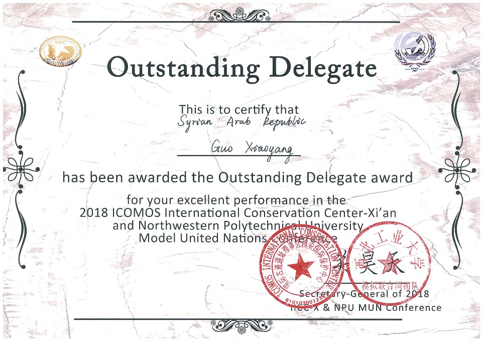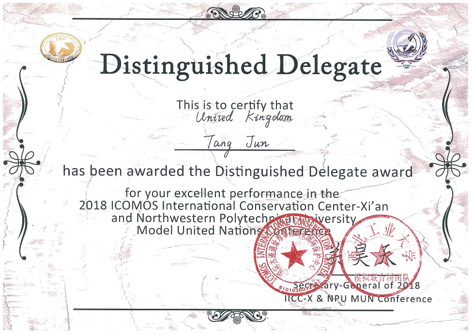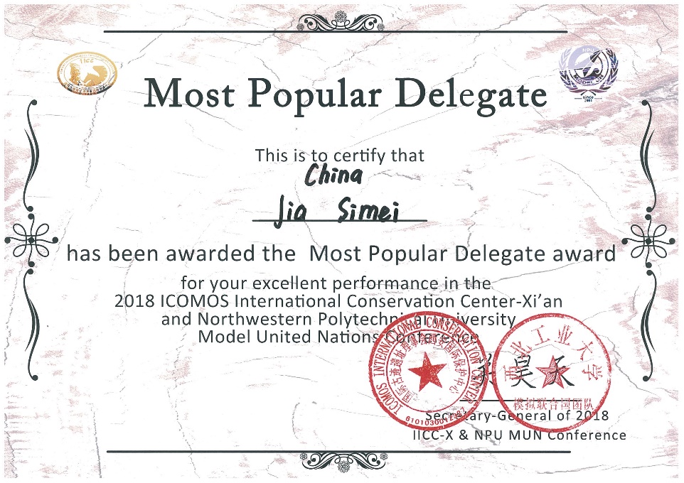 由国际古迹遗址理事会西安国际保护中心(IICC-X)与西北工业大学模拟联合国团队(NPUMUN)联合举办的IICC-X&NPUMUN模拟联合国大会5月17日-5月19在西安市大唐西市博物馆正式举办。我校共派出七名代表参加,最终斩获“最佳代表奖”等五项大奖。